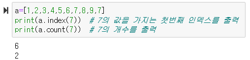 | 리스트명.count(찾을 값) | 리스트 내에서 해당 값을 찾아서 그 위치[인덱스]를 출력 |