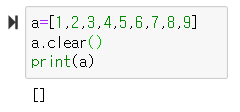 | 리스트.clear() | 리스트에 있는 요소들을 전부 제거하여 빈 리스트를 생성 |