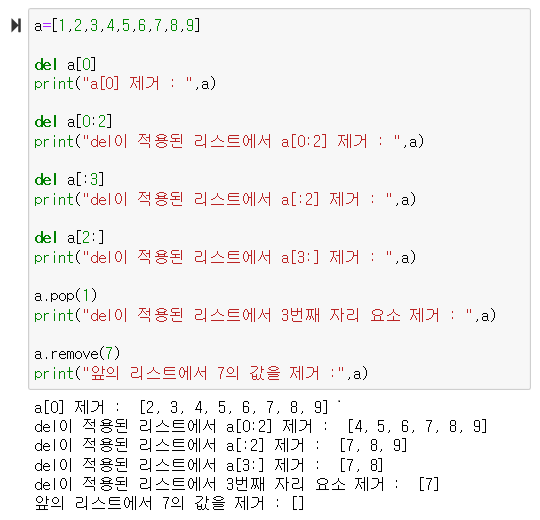 | 키워드 사용 | del 리스트명[인덱스] | 리스트의 특정 인덱스에 있는 요소를 제거 |