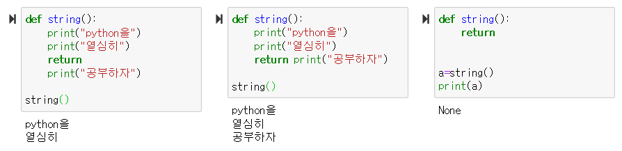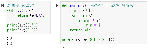 | 사용자 정의함수 | 파이썬에서 사용자가 임의로 만들어서 사용하는 함수 |