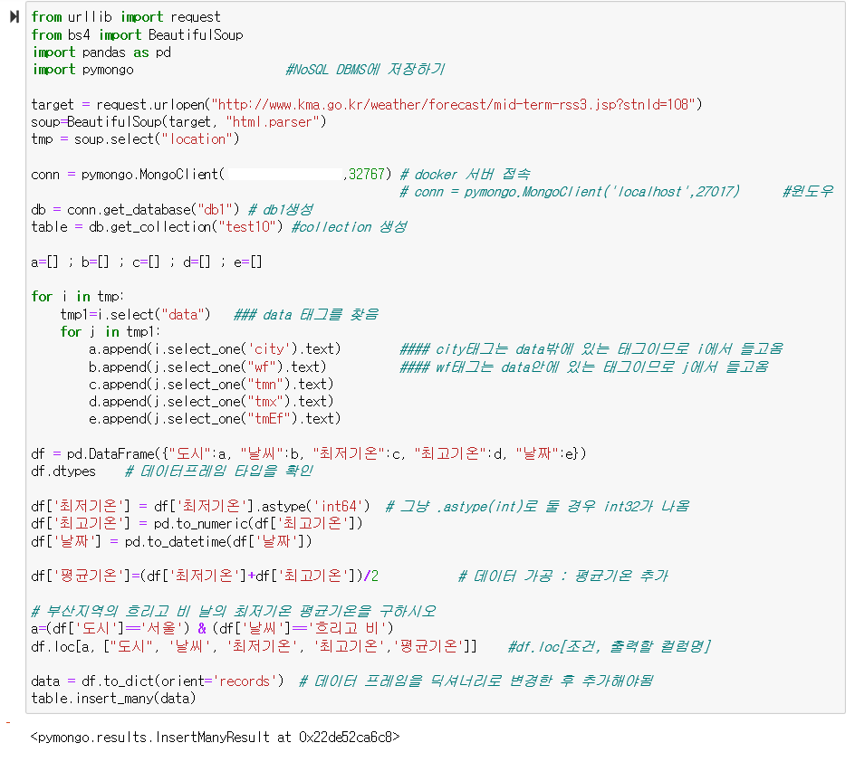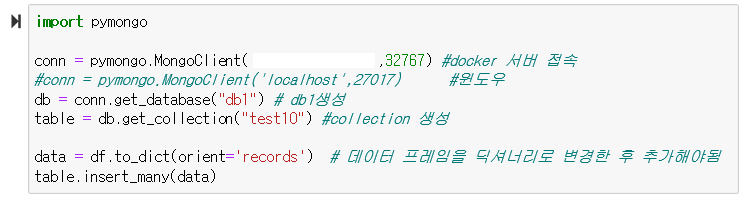 - 데이터를 추가할 때에는 반드시 docker를 켜서 컨테이너를 실행시킨 뒤 NoSQL을 위한 pymongo를 실행시킴
