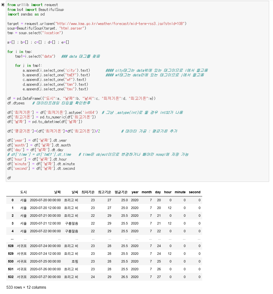 가져온 데이터를 데이터프레임으로 만들기