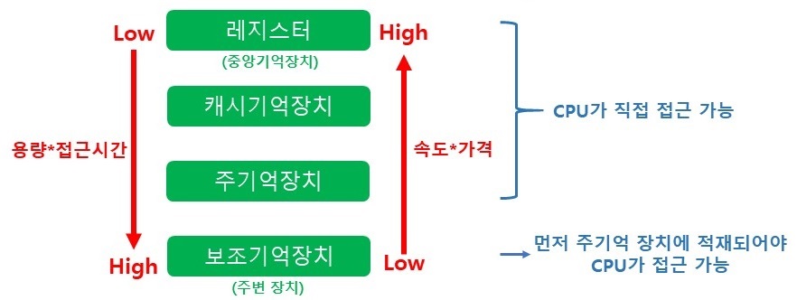 보조기억장치에 비해 처리속도가 빠르고 가격은 고가