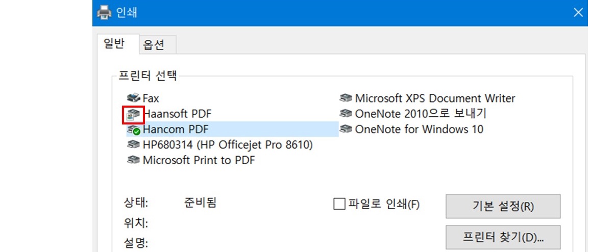 네트워크 프린터나 추가 설치된 프린터도 기본 프린터로 설정 가능하지만 기본 프린터는 하나만 지정 가능