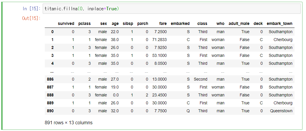 null값을 평균값, 0 등으로 처리할때는 fillna(0, inplace=True)을 사용하여 대체