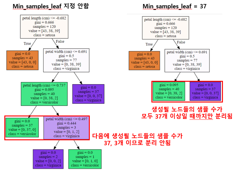 ex> min_samples_leaf=37인 경우, 생성될 노드들의 샘플 수가 모두 37개 이상이어야만 split한다는 의미!