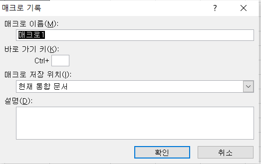 매크로 기록 대화상자에서는 매크로이름, 바로가기키, 매크로 저장위치, 설명을 지정 가능