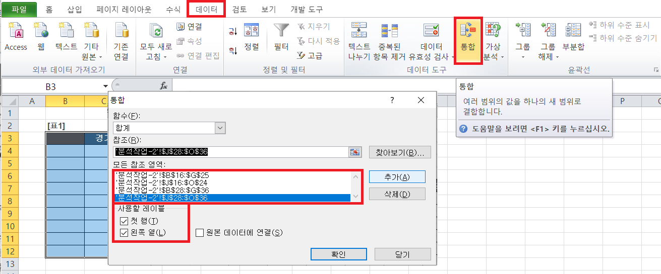 | 사용할 레이블 | 첫 행 : 참조된 데이터 범위의 첫 행을 통합된 데이터의 첫 행(열 이름)으로 사용 왼쪽 열 : 참조된 데이터 범위의 왼쪽 열을 통합된 데이터의 첫 행(행 이름)으로 사용 |