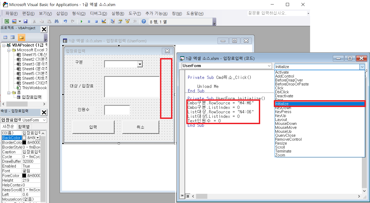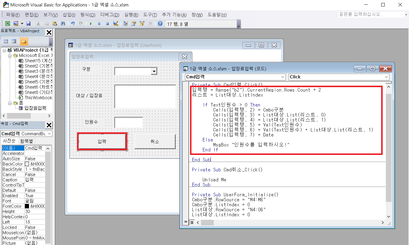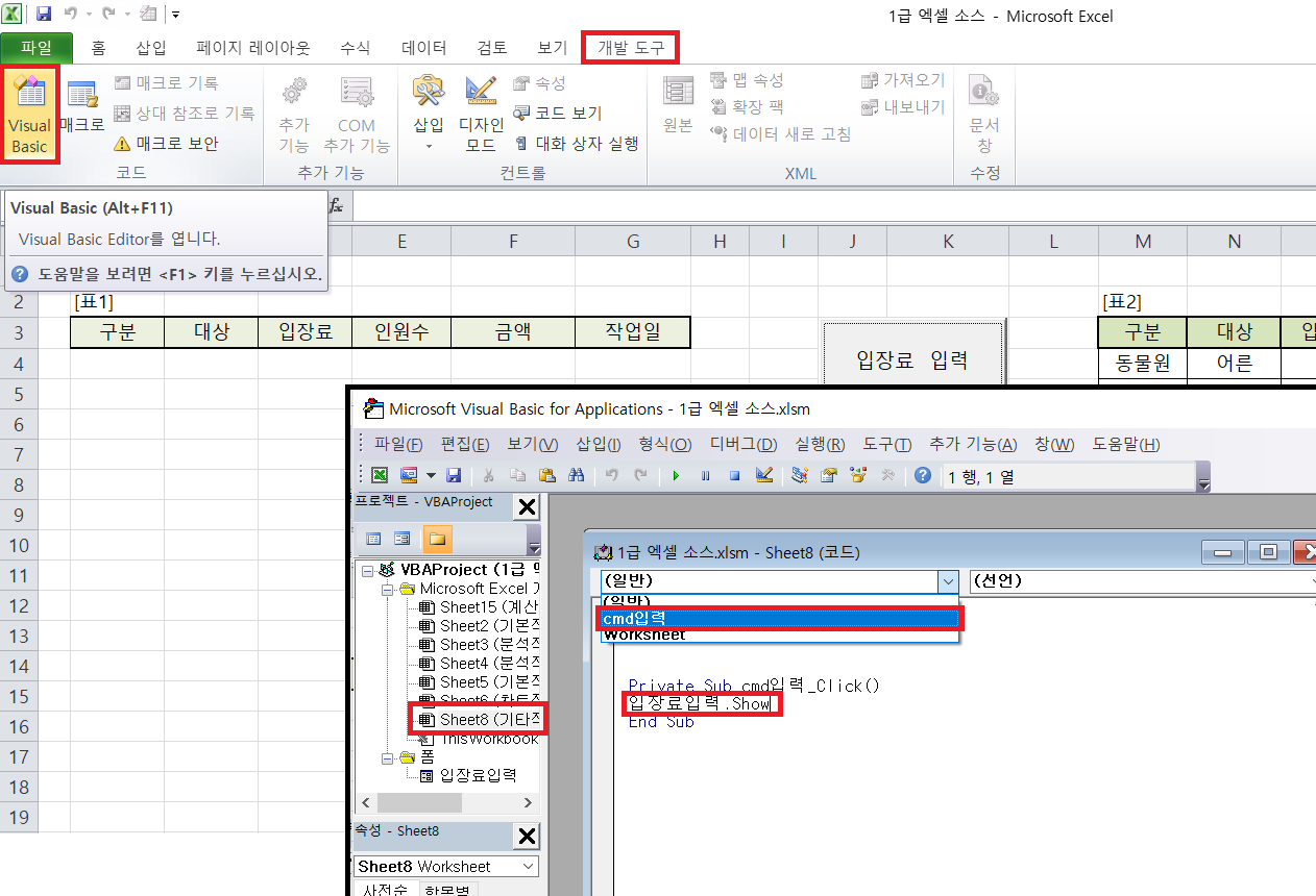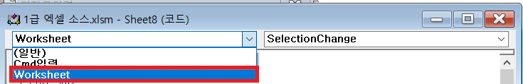 폼이 아닌 해당시트에서 작업!! [해당시트 선택 후, worksheet클릭]