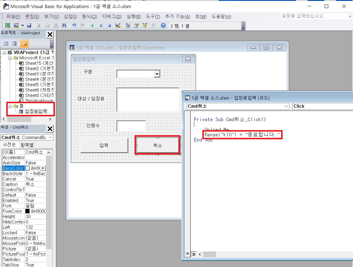 + '취소' 버튼을 눌리면 폼 닫히면서 [K10]셀에 '종료합니다' 문자열이 출력되도록 하기