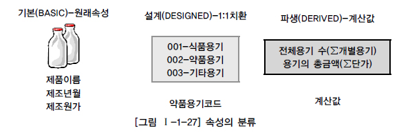 | 기본 속성 | 비즈니스 프로세스에서 도출되는 본래의 속성 ex> 원금, 예치기간, 이자율, 회원 ID, 이름 등 |