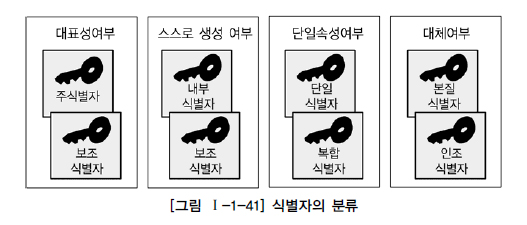 | 대표성 여부에 따른 식별자 종류 | 주식별자 : 유일성과 최소성을 만족하면서 엔터티를 대표하는 식별자 다른 엔터티와 참조 관계로 연결될 수 있음 보조 식별자 : 유일성과 최소성은 만족하지만 대표성은 만족하지 못하는 식별자 다른 엔터티와 참조 관계를 가지지 못함 |