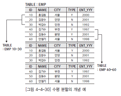 DBMS차원에서의 수평 테이블 분할 방법에는 범위 분할, 해쉬분할, 복합 분할 등이 있음