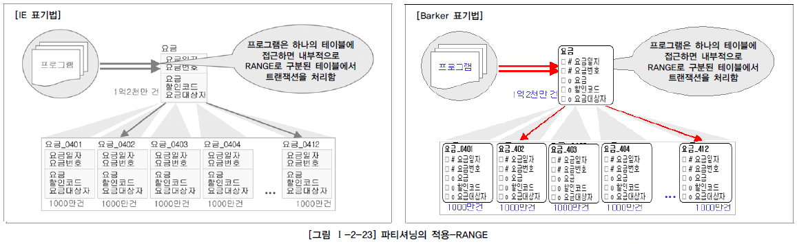 테이블에 대한 수평/수직 분할은 4가지 원칙을 적용해 결정 1> 데이터 모델링을 완성한다. 2> 데이터 베이스 용량을 산정한다. ※ 용량산정은 어느 테이블에 데이터의 양이 대용량이 되는지 분석하는 것 3> 대량 데이터가 처리되는 테이블에 대해서 트랜잭션 처리 패턴을 분석한다. 4> 칼럼 단위로 집중화된 처리가 발생하는지, 로우 단위로 집중화된 처리가 발생하는지 분석해 집중화된 단위로 테이블을 분리하는 것을 검토
