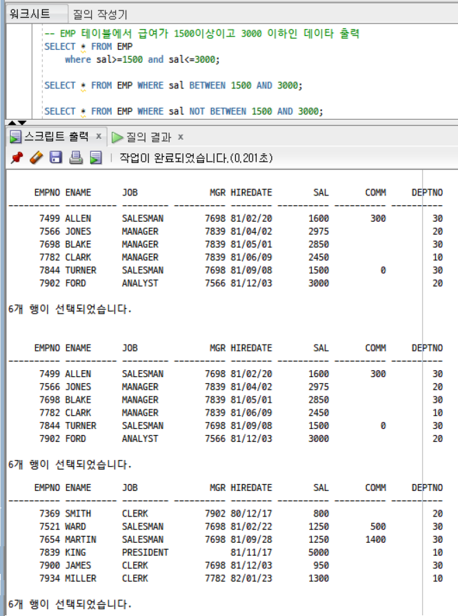 | 열이름 BETWEEN A AND B | 해당 열에서 A과 B 사이에 속하는 데이터를 조회할 때 사용 |