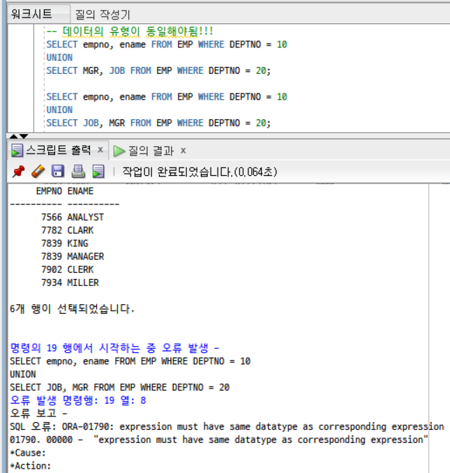 2개의 SELECT 구문에 조회되는 데이터 형태가 동일해야 됨!!