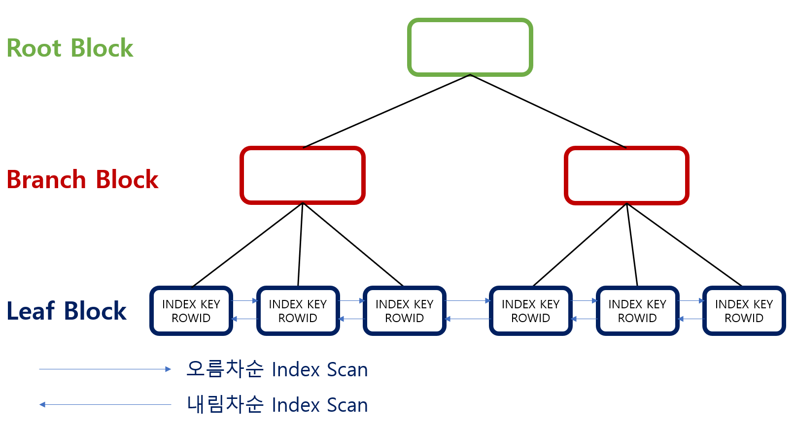 INDEX구조는 Root Block, Branck Block, Leaf Block으로 구성 Root Block : 인덱스 트리 가장 상위에 있는 노드 Branch Block : Root Block과 Leaf Block을 연결하는 노드 Leaf Block : 인덱스 트리 가장 하위에 있는 노드 [INDEX KEY와 ROWID로 구성] ※ Leaf Block의 INDEX KEY는 정렬되어 저장되어 있음 ※ Leaf Block은 Double Linked List형태로 되어 있어 양방향 탐색이 가능