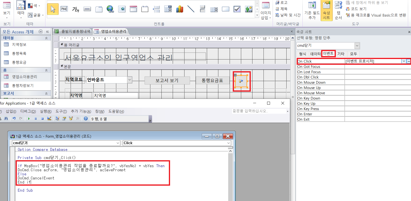 | Close | On Close | 폼이나 보고서를 닫아 화면에서 사라질 때 발생 |