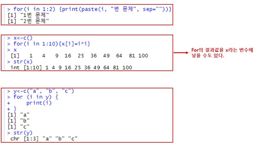for(variable in vector) { }