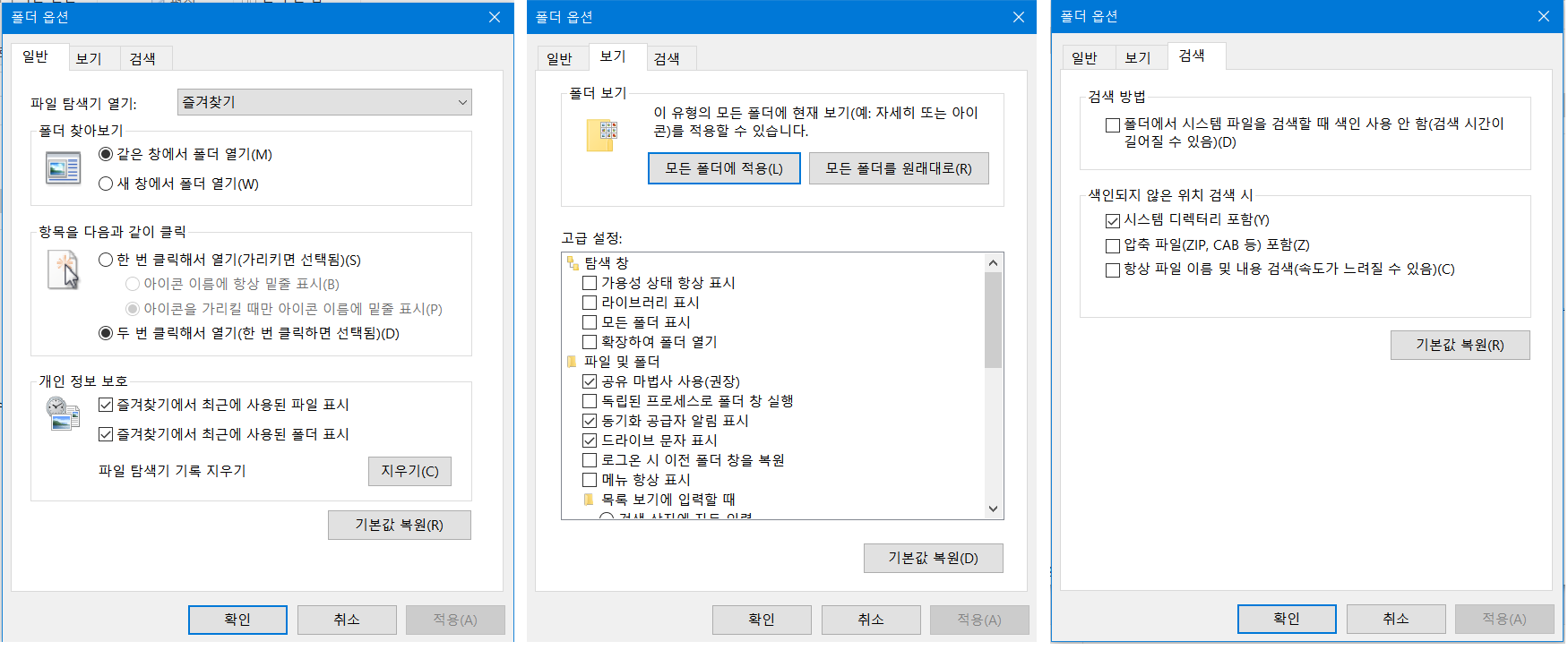 폴더 옵션에서는 파일이나 폴더의 보기 형식, 검색 방법 등에 대한 설정을 변경