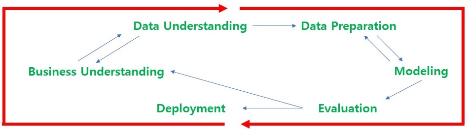 | Business Understanding | 비즈니스 관점에서 프로젝트 목적과 요구사항을 이해하기 위한 단계 도메인 지식을 데이터 분석을 위한 문제정의로 변경하고 초기 프로젝트 계획을 수립 |
