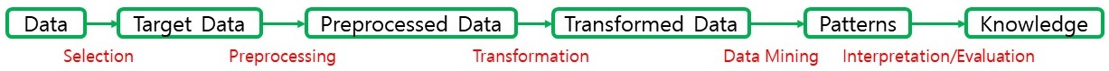 1996년 Fayyad가 프로파일링 기술을 기반으로 데이터로부터 통계적 패턴이나 지식을 찾기 위해 활용할 수 있도록 체계적으로 정리한 데이터 마이닝 프로세스