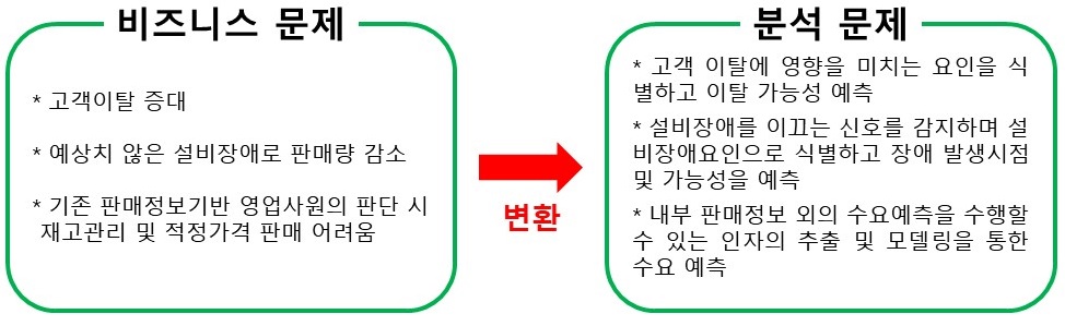 → 이 단계는 이를 달성하기 위해 필요한 데이터 및 기법[How]을 정의하기 위한 데이터 분석의 문제로의 변환을 수행