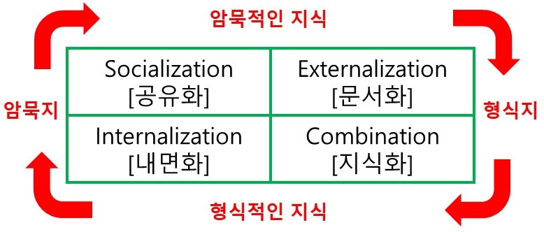 | 공통화, 내면화 [개인에게 축적된 내면화된 지식 → 조직의 지식으로 공통화 |