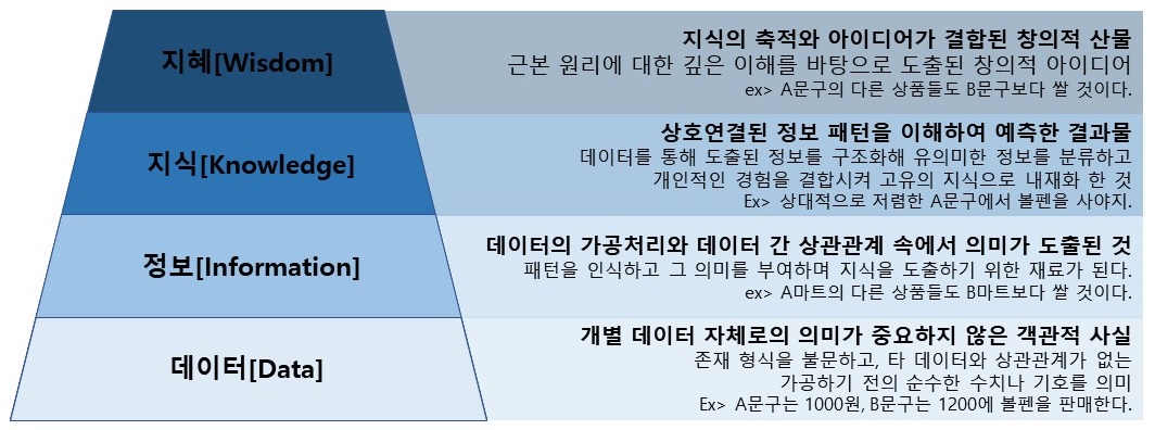 데이터, 정보, 지식을 통해 최종적으로 지혜를 얻어내는 과정을 계층 구조로 설명