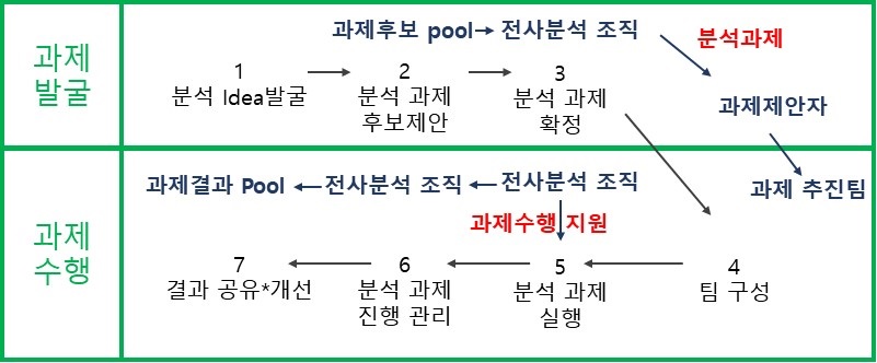 | 과제 수행 | 분석을 수행할 팀을 구성하고 분석과제 실행시 지속적인 모니터링과 과제결가를 공유하고 개선하는 절차를 수행 |