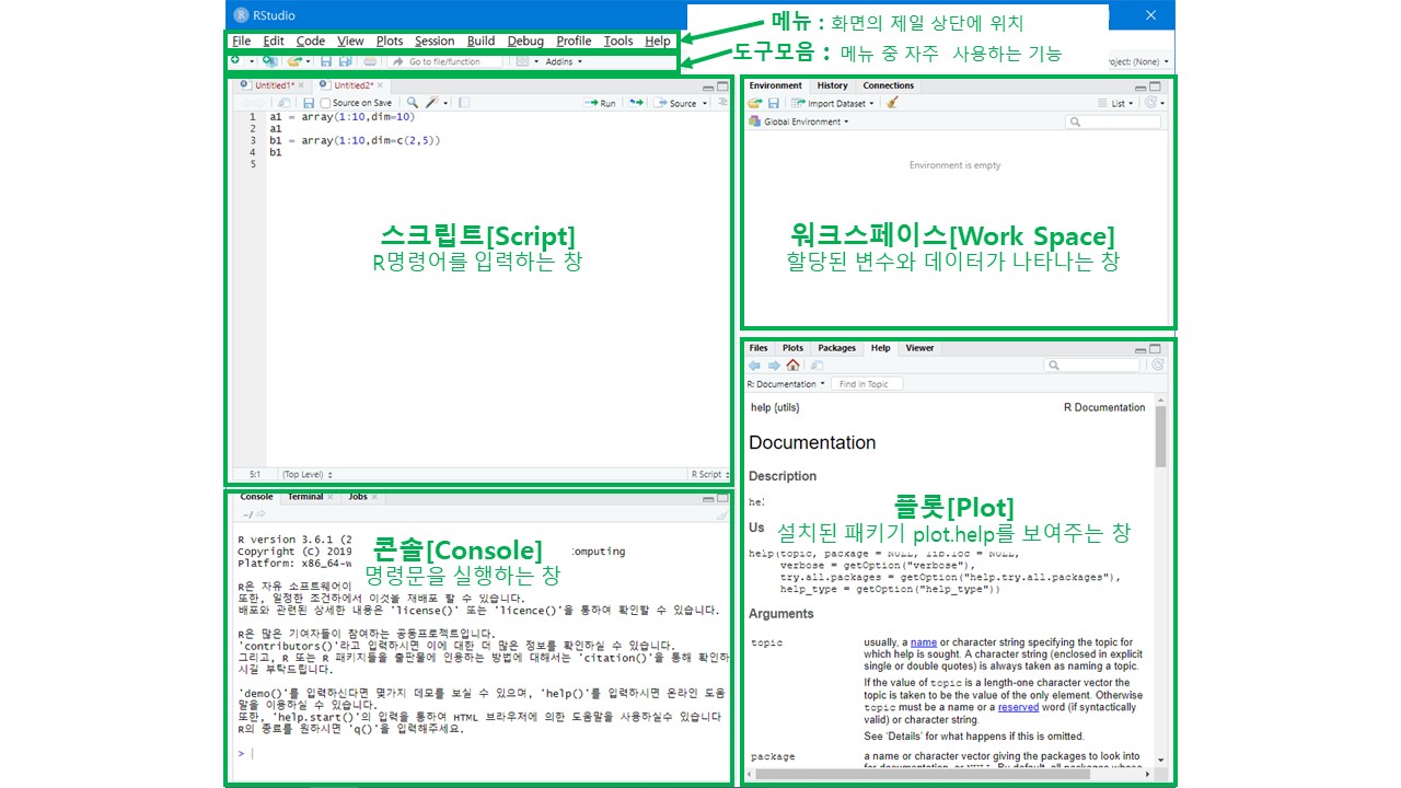 콘솔(Console) : R의 입력된 명령어가 실행되는 창