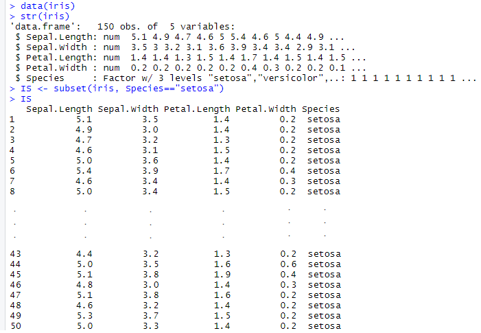 ※ iris 데이터셋에서 subset가 setosa인 항목들만을 추출
