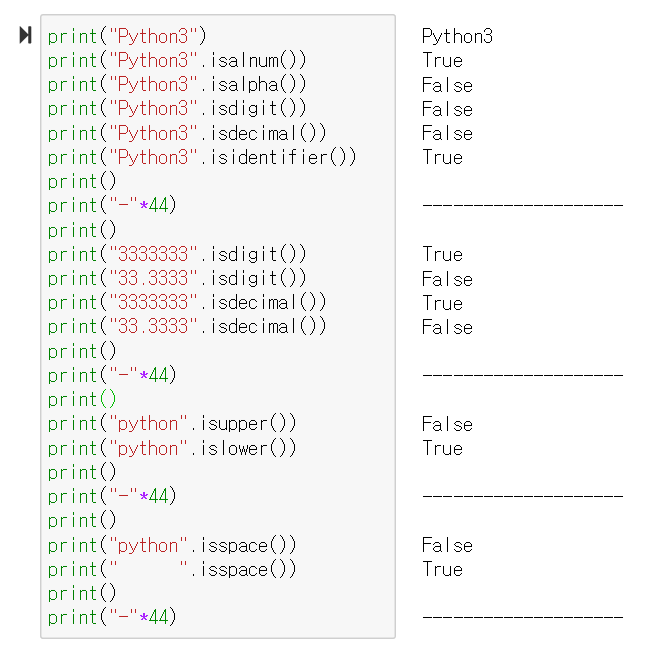 | .isalnum( ) | 문자열이 알파벳 또는 숫자로만 구성되어 있는지 확인 | True or False |